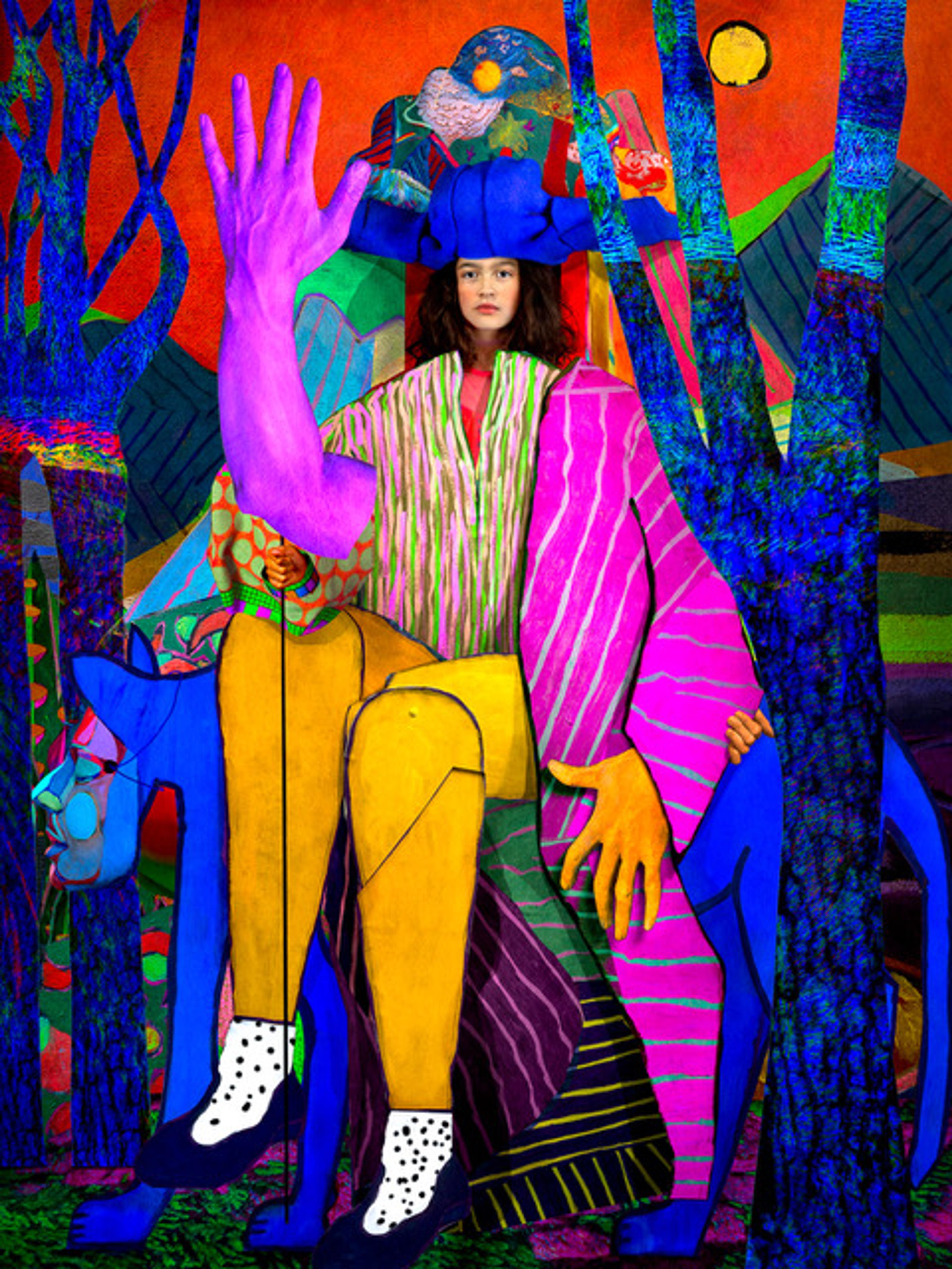 构建人物的最初想法来自于超现实主义游戏《Cadavre Exquis》,在游戏中,艺术家们通过将身体分成两个隐藏的部分来创造一个共享的身体 —— 画面从而呈现了意想不到的联想和比例,身体从不完全属于自己,四肢同时属于几个女人。